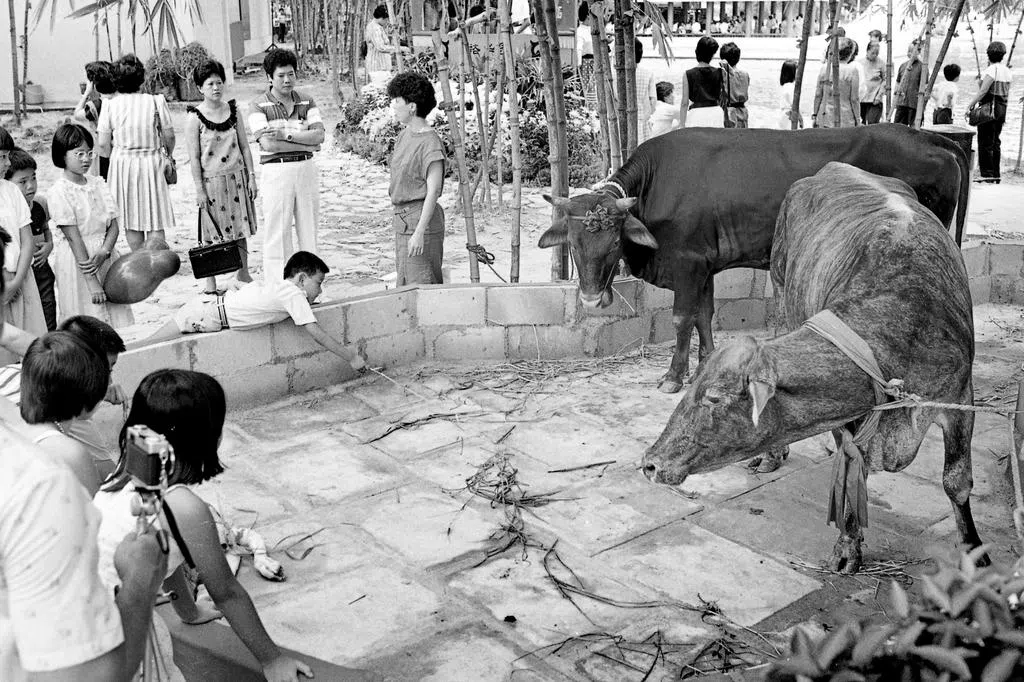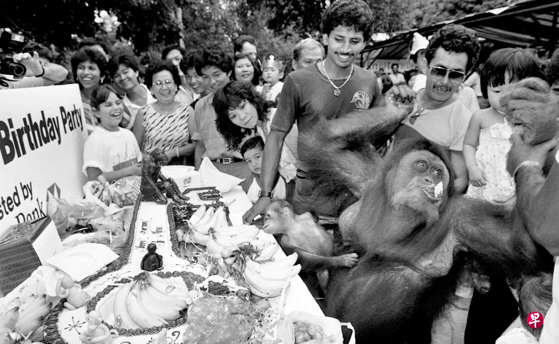 曾到过新加坡动物园的游客,对这只名为“阿明”(Ah Meng)的红毛猩猩(Orang Utan)应该不会陌生。阿明的原生地是印度尼西亚苏门答腊,为当地一户家庭非法饲养,于1971年被救出后落户新加坡动物园。图为“阿明”1985年的生日庆祝会。