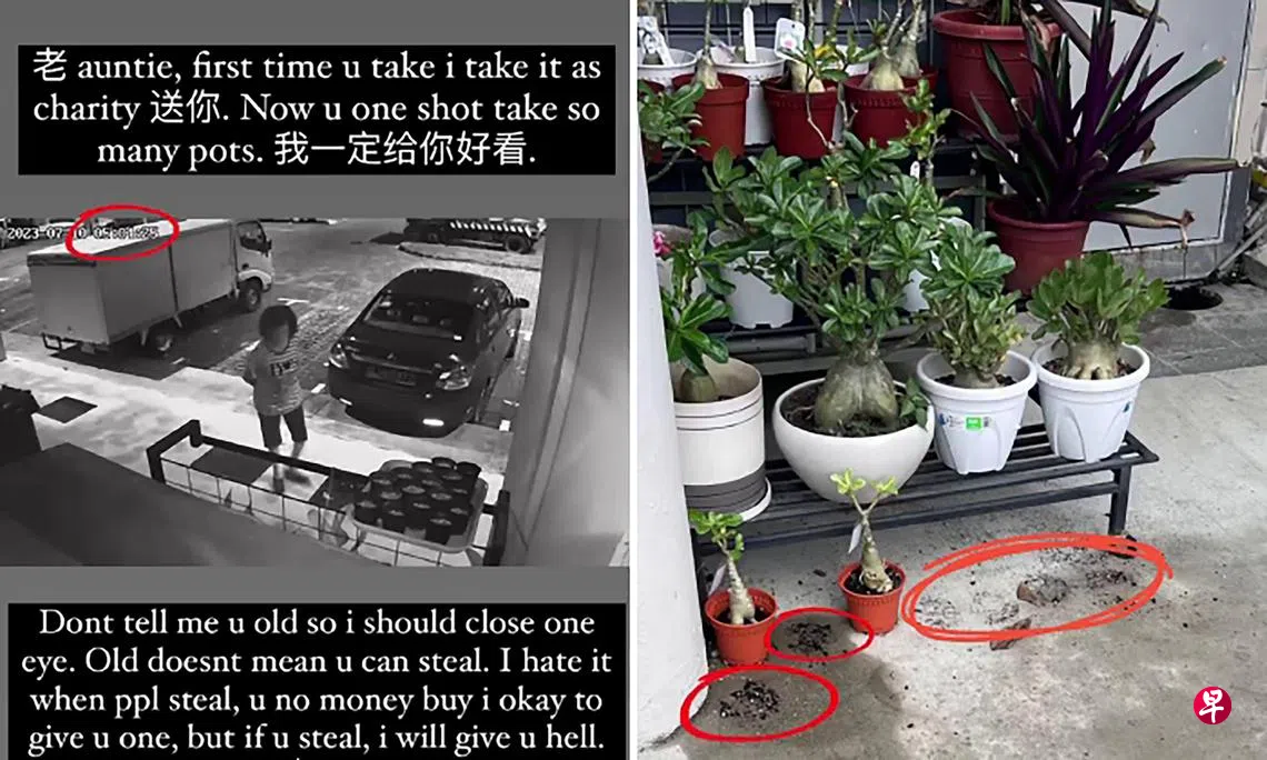 位于加冷峇鲁第65座组屋楼下的水果店老板日前在Instagram公开几段视频,指一名老妇多次拿走摆在他店后方的盆栽。