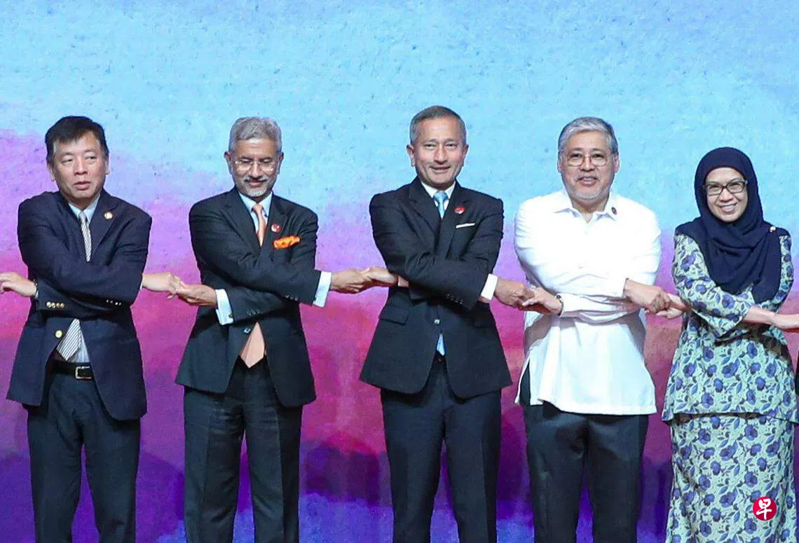 在印度尼西亚雅加达出席亚细安外长会议和系列会议的我国外交部长维文医生星期四(7月13日)上午和印度外交部长苏杰生联合主持亚细安—印度扩大外长会议时,汇报亚细安和印度最新的合作进展。