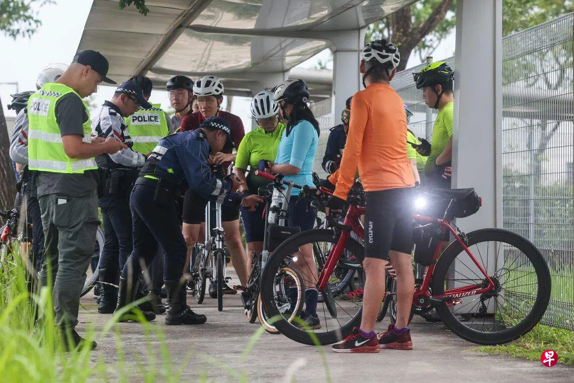 交警和陆交局的执法队伍上星期六(8日)展开行动时,随行的《联合早报》记者目睹了执法人员在实里达西兵营路一带,拦下一组至少15人在路上违例骑行的脚踏车车队。