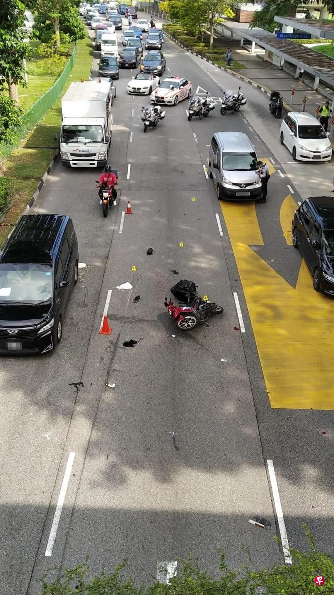照片显示,涉事电单车停在中间车道,罗厘则停在最左边车道。罗厘旁的草地设了蓝色帐篷,相信遮掩着死者的遗体。另外,罗厘底下有一摊血迹。