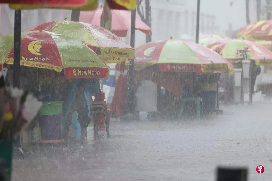 本地多个地区星期四(7月20日)早上下起滂沱大雨,四马路观音庙外的摊贩,不得不降低大伞的高度,蜷缩在伞下,避免货物和身体被大雨淋湿。