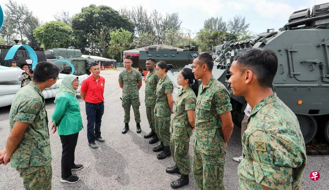 哈莉玛总统星期六(7月22日)早上慰问今年国庆庆典全面防卫检阅礼的参与者。她与负责军车维护的军人交流,并参观了代表全面防卫六大支柱的六辆花车。哈莉玛感谢参与者的辛勤付出,并向所有支持全面防卫的新加坡人致敬。