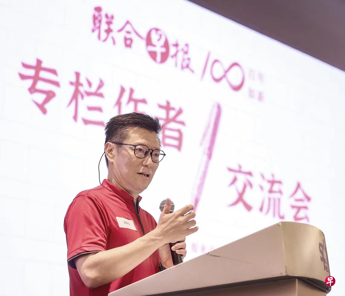 《联合早报》总编辑吴新迪星期天(7月23日)在早报百年报庆专栏作者交流会上,感谢专栏作者坚持不懈,为早报投稿所付出的努力。