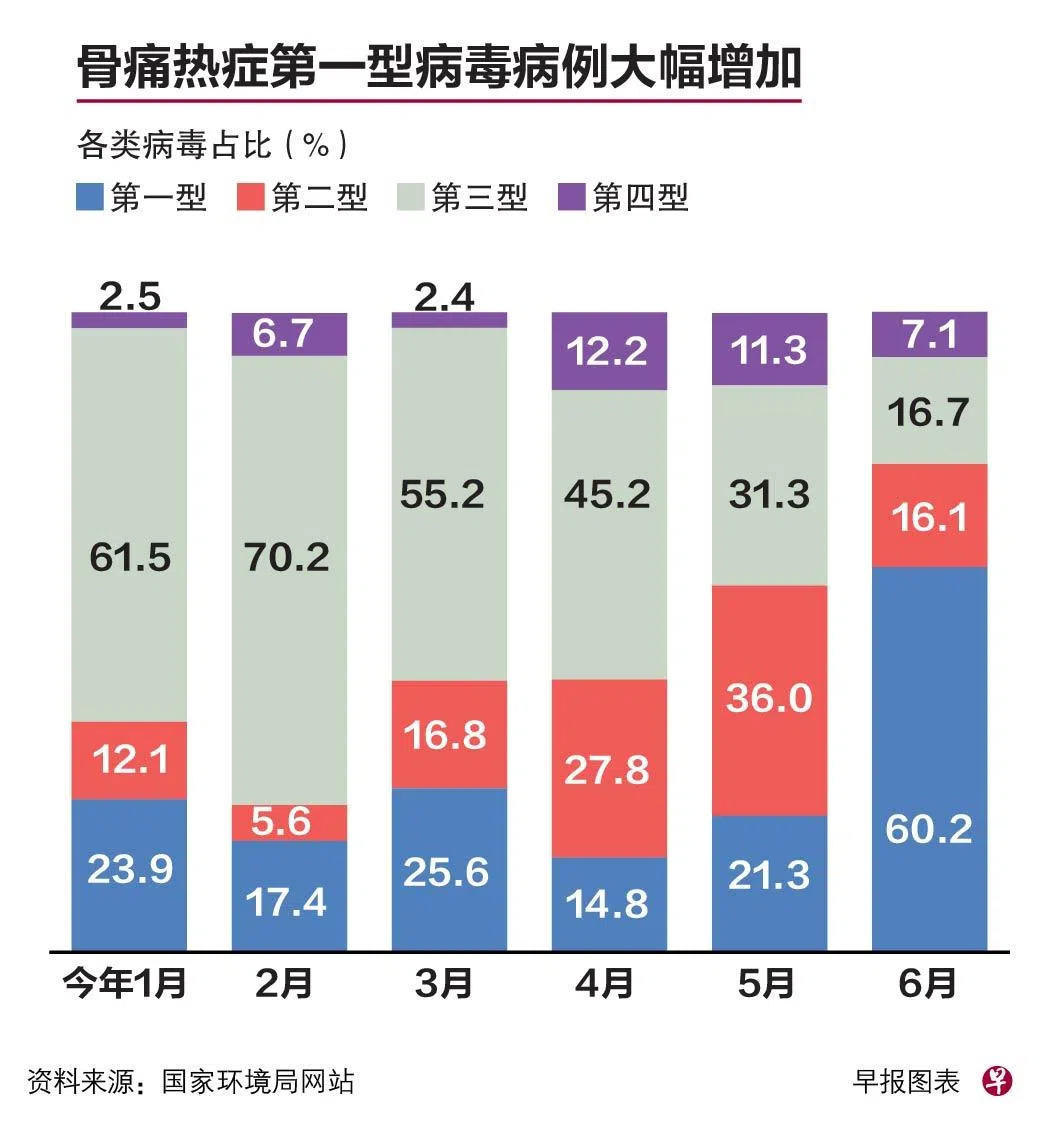 值得关注的是,第一型病毒(Den-1)病例突然大幅度上升,占了6月病例总数的约六成。在3月份第一型病毒占所有病例的约四分之一,5月则只有21.3%。