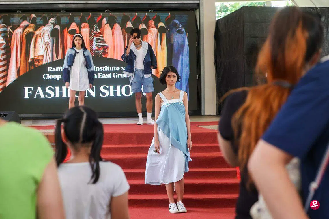 24名莱佛士设计学院学生星期天(7月30日)在义顺集选区的“义顺绿色嘉年华”(Nee Soon Green Carnival)举行时装秀,五名模特儿穿着被赋予新生命的旧牛仔裤、衬衫和床单等制成的衣物,亮丽登场。
