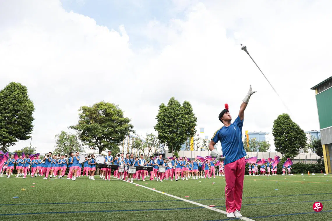 在军乐队演奏的韩国防弹少年团(BTS)歌曲“Dynamite”旋律中,汗流浃背的中四生何柏英(16岁)在操场上,与其他参加今年国庆庆典演出的德义中学同学,紧锣密鼓地为傍晚的第一场预演排练。