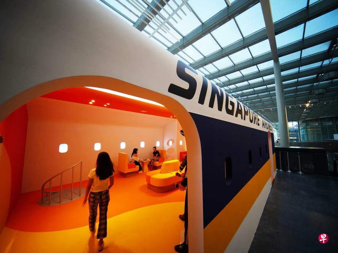 其中一个展室“旅行隧道”的设计灵感源自新加坡航空公司,还原了新航1976年首次推出的莱佛士休息室的原貌,展出内容包括可转化为床的头等舱座椅、在特定航线上提供的机上现场娱乐表演等,让公众感受上世纪七八十年代的新航客机。