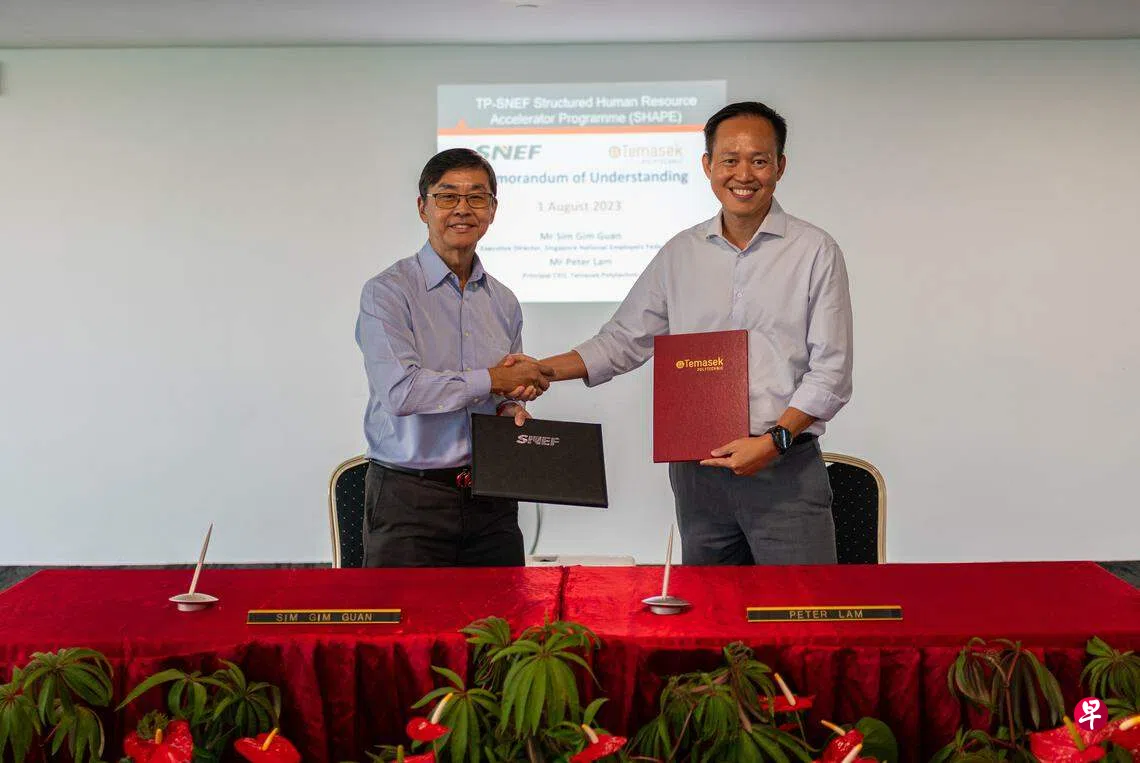 雇联与淡马锡理工于8月1日(星期二)签署谅解备忘录,通过系统化的人力资源促进计划(Structured Human Resource Accelerator Programme,简称SHAPE)达成合作。