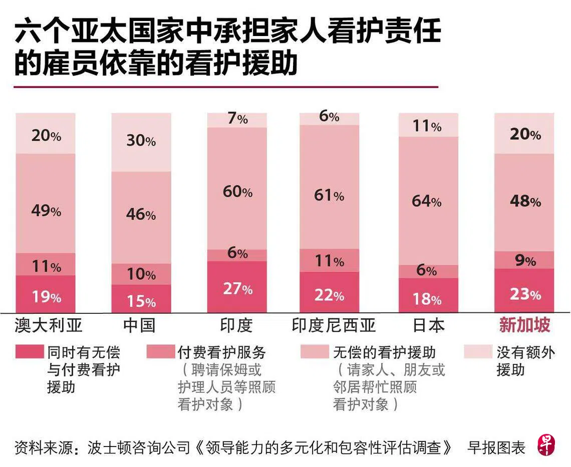 波士顿咨询公司去年7月至11月对约9000名来自新加坡、澳大利亚、中国、印度、日本和印度尼西亚六个亚太国家、任职于中型与大型公司的雇员展开调查,旨在了解须兼顾看护责任与工作的雇员,在职场所面对的挑战,以及对于继续工作或离职的意愿等。