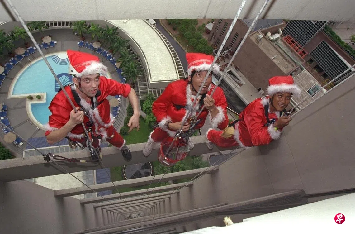 适逢1997年的圣诞佳节,三名圣诞老人展现“蜘蛛神功”飞檐走壁,给酒店访客带来意外惊喜,也不禁让人捏了一把冷汗。