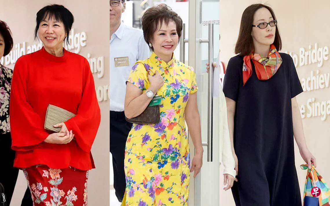 陈钦亮夫人郑㛢𤪧(67岁)昨天身穿亮丽的黄色印花旗袍,搭配路易威登的小单肩包和白色高跟鞋。佩饰方面,她戴了一双耳环和一只手表。