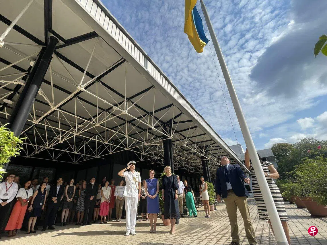 8月23日是乌克兰国旗日,英国驻新加坡最高专员公署特别在这一天为乌克兰举行升旗仪式,重申英国会在这场战争中,与乌克兰站在同一阵线,并继续提供人道、经济和军事援助。
