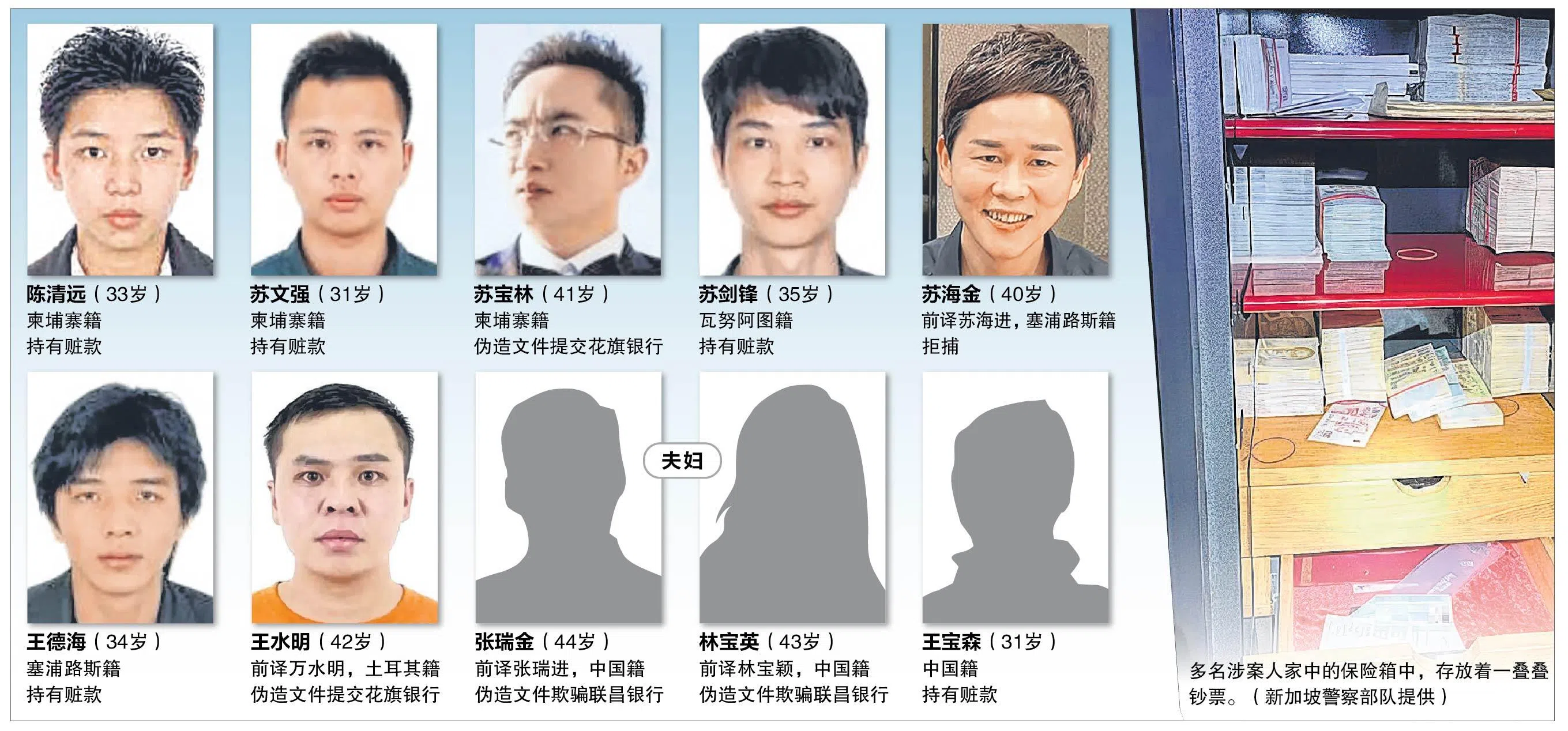 涉案被告8月15日在警方的大规模逮捕行动中落网,隔天在涉嫌伪造文件和洗黑钱等罪名下被控上法庭。他们相信多数原籍中国福建,三人还是中国公民,其余虽也持中国护照,但国籍各有不同。