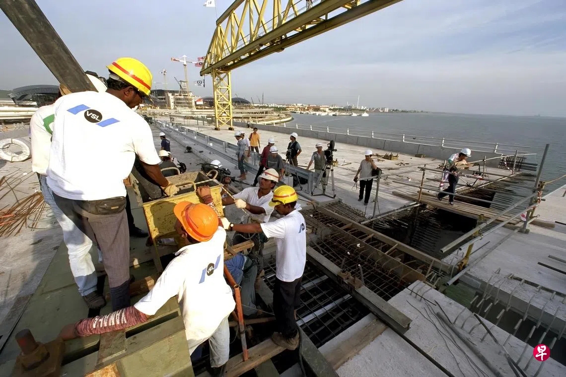 图中的照片摄于1997年,当时建筑工人正把平底船载来的混凝土,注入两个桥段间。两个桥段间的距离为两公尺。桥的两端连接着我国大士和马来西亚柔佛州西南部振林山(Gelang Patah)的丹戎古邦(Tanjung Kupang)。