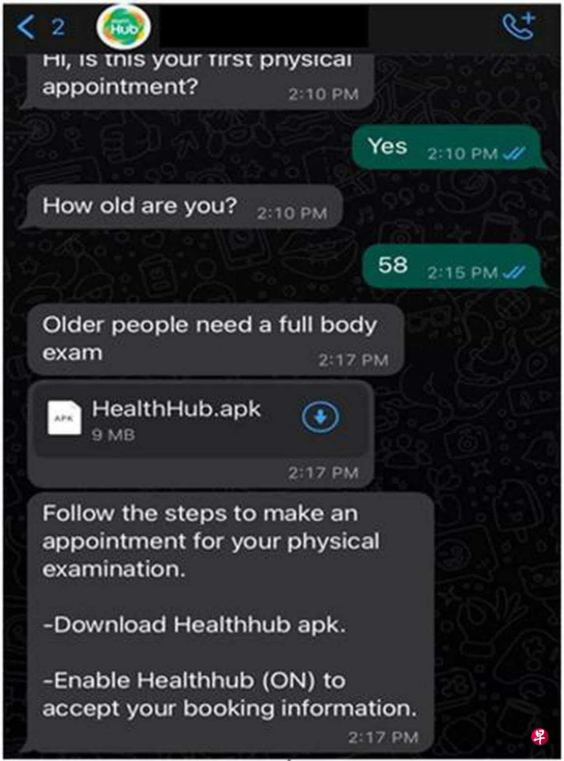 点击链接后,公众会被转往一个据称是“保健资讯网(HealthHub)”的WhatsApp聊天室,接着一步步落入圈套,最终下载含有恶意软件的安卓软件包(Android Package Kit,简称APK)。