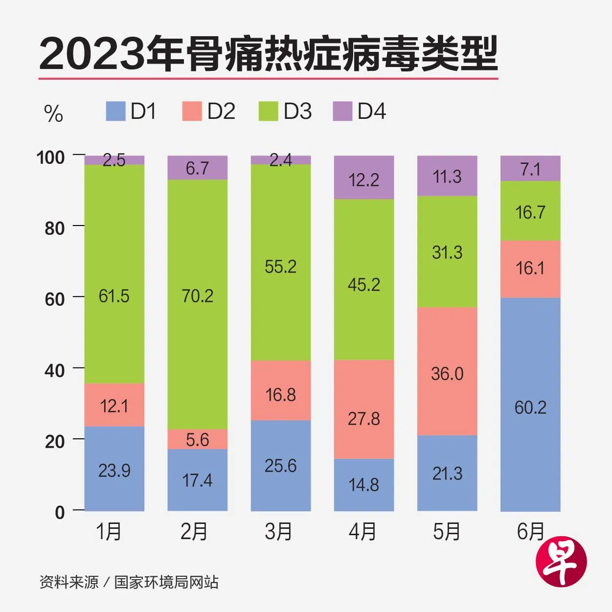 今年的病例虽然没有去年多,但是根据国家环境局星期三发出的文告,过去两个月来,本地骨痛热症病毒类型开始转变,原本以第三型病毒占多数,现则以第一型病毒为主。这意味着,骨痛热症病例可能会在几个月后激增。