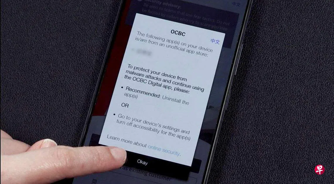 《联合早报》上个月报道,华侨银行为了进一步保护客户推出新措施。每当客户使用华侨银行应用时,该应用就会自行侦测客户手机,检查手机是否有下载自非官方应用商店的应用,并在侦测到这类应用时弹出警告,客户短时间内不能使用华侨银行应用。