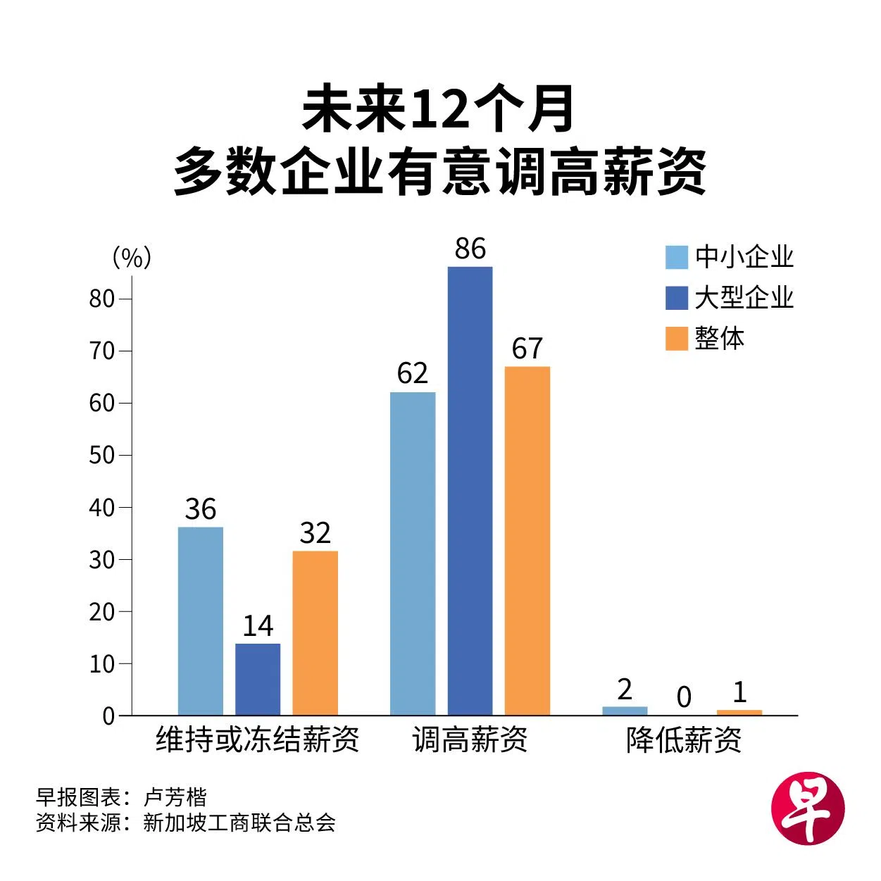 尽管接下来的经济前景疲弱,多数本地企业仍对就业情况保持乐观,认为未来12个月的全职员工人数会维持不变,甚至可能增加。此外,超过八成的大企业预计未来12个月会调高薪资。