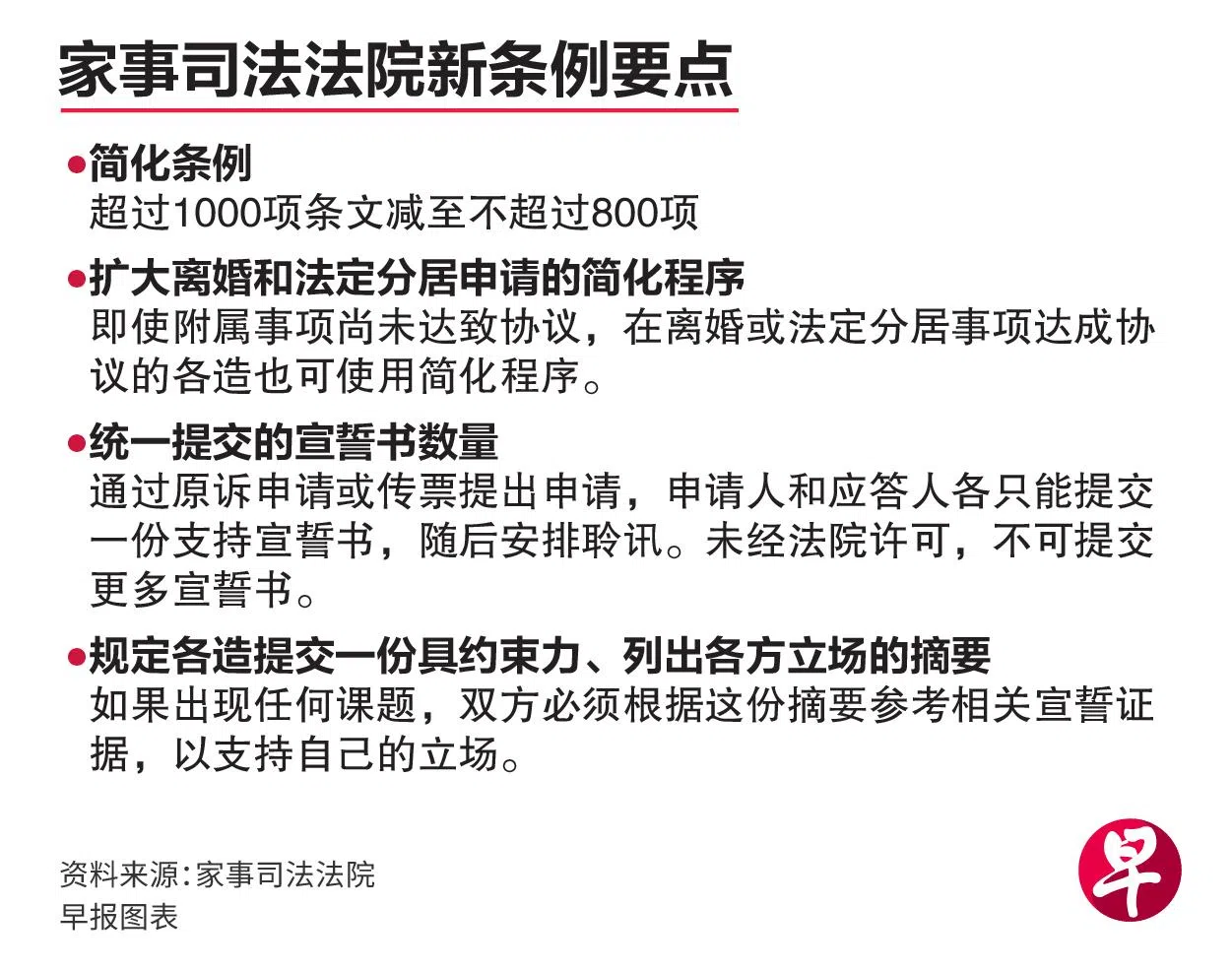 家事司法法院2024年首季起大幅度简化办理离婚事宜的流程,包括统一和限制提交的宣誓书数量,旨在减少案件的拖延、复杂性和各造的对抗性,并使用通俗易懂的法庭术语。