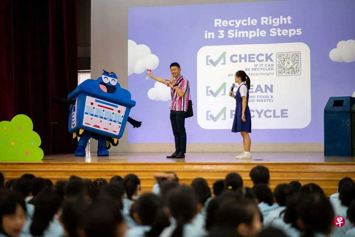 交通部兼永续发展与环境部高级政务次长马炎庆于星期四(9月14日)在安泰小学为“2023年推广正确回收运动”主持推介会。会上呈献短剧,通过回收吉祥物Bloobin教育学生有关可回收物品的种类,以及应该如何正确回收。