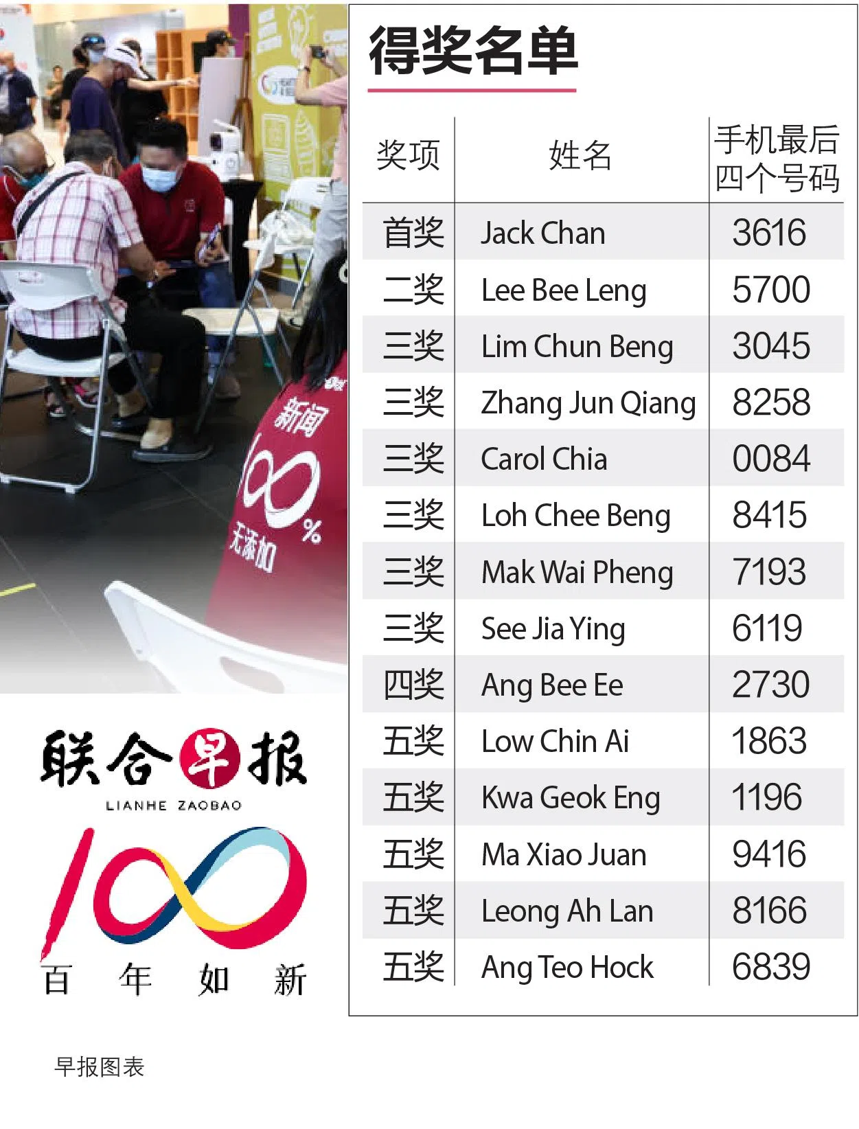 《联合早报》百年报庆大抽奖为期两个月,在9月5日午夜截止。活动开放给所有早报VIP(订户)和早报会员(注册用户)参加。参加者须填上简单的个人资料,并且留言说明喜欢阅读《联合早报》的原因,获选的读者有机会赢取丰富奖品。