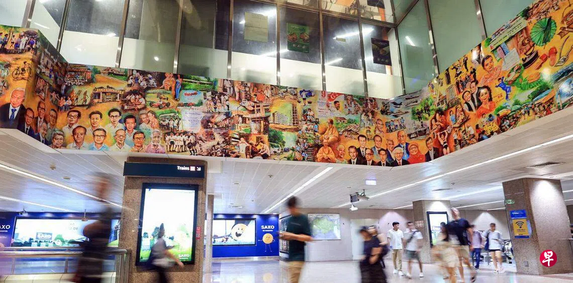 孩子在农村玩乐、木屋的乡村场景、成为英国殖民地、经历二战再到开国总理李光耀宣布新加坡独立;民众到丹戎巴葛地铁站售票厅,就能看到栩栩如生的长壁画,回顾新加坡历史。