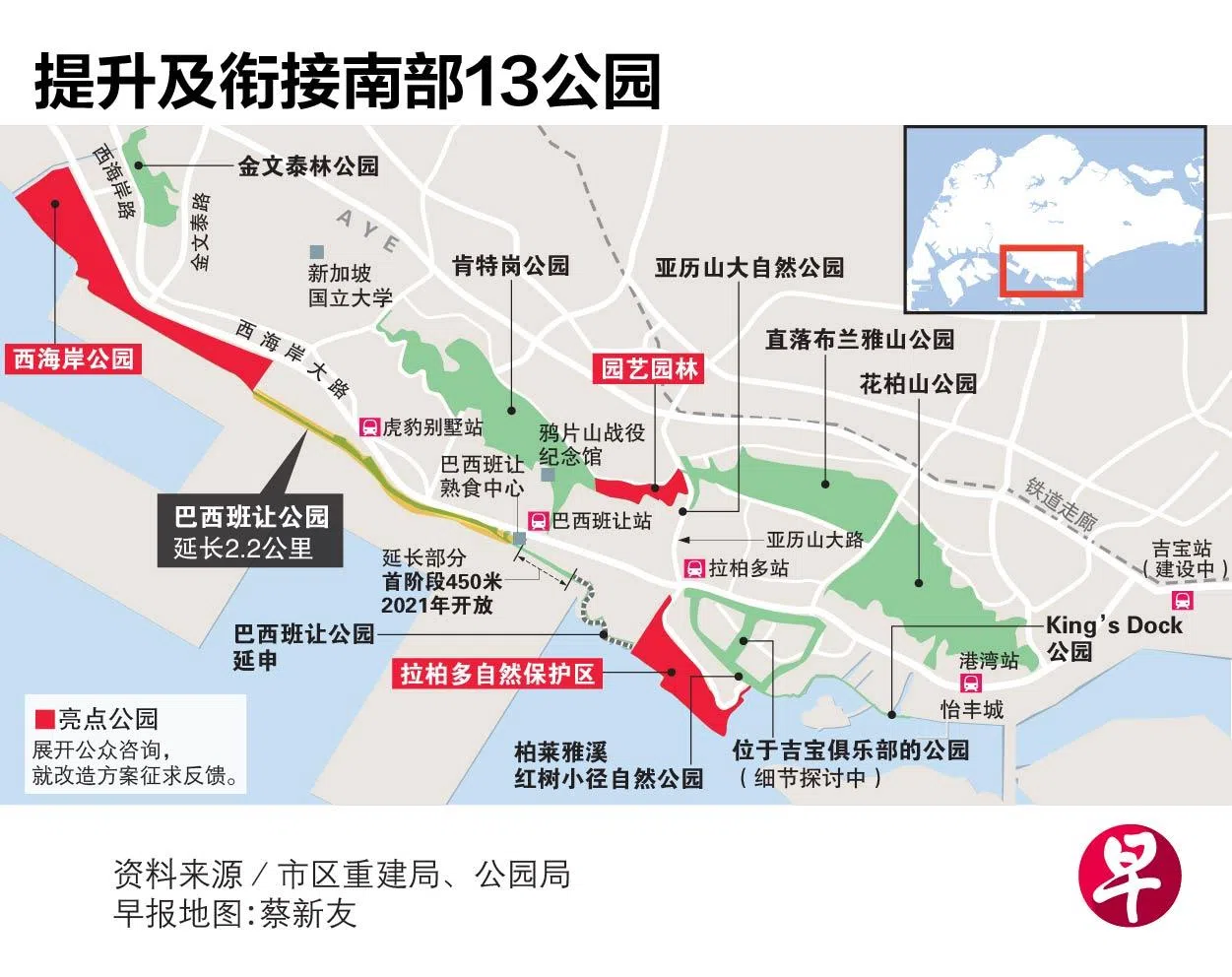 配合南部濒水区的发展,国家公园局计划改造南部13个公园,通过建造主题走道等方法加强公园之间的衔接,为民众提供更多贴近大自然的休闲和游乐好去处。