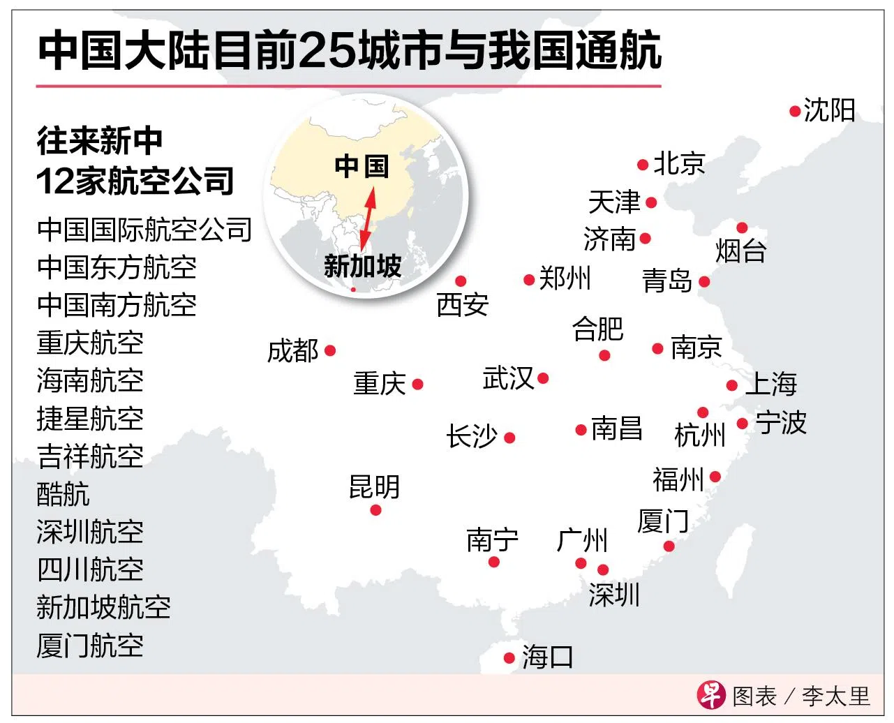 目前,最多乘客往返的首五个中国城市分别是上海、广州、北京、杭州和南京。其中,按今年8月的乘客量计,上海已成樟宜机场第12大客运城市。