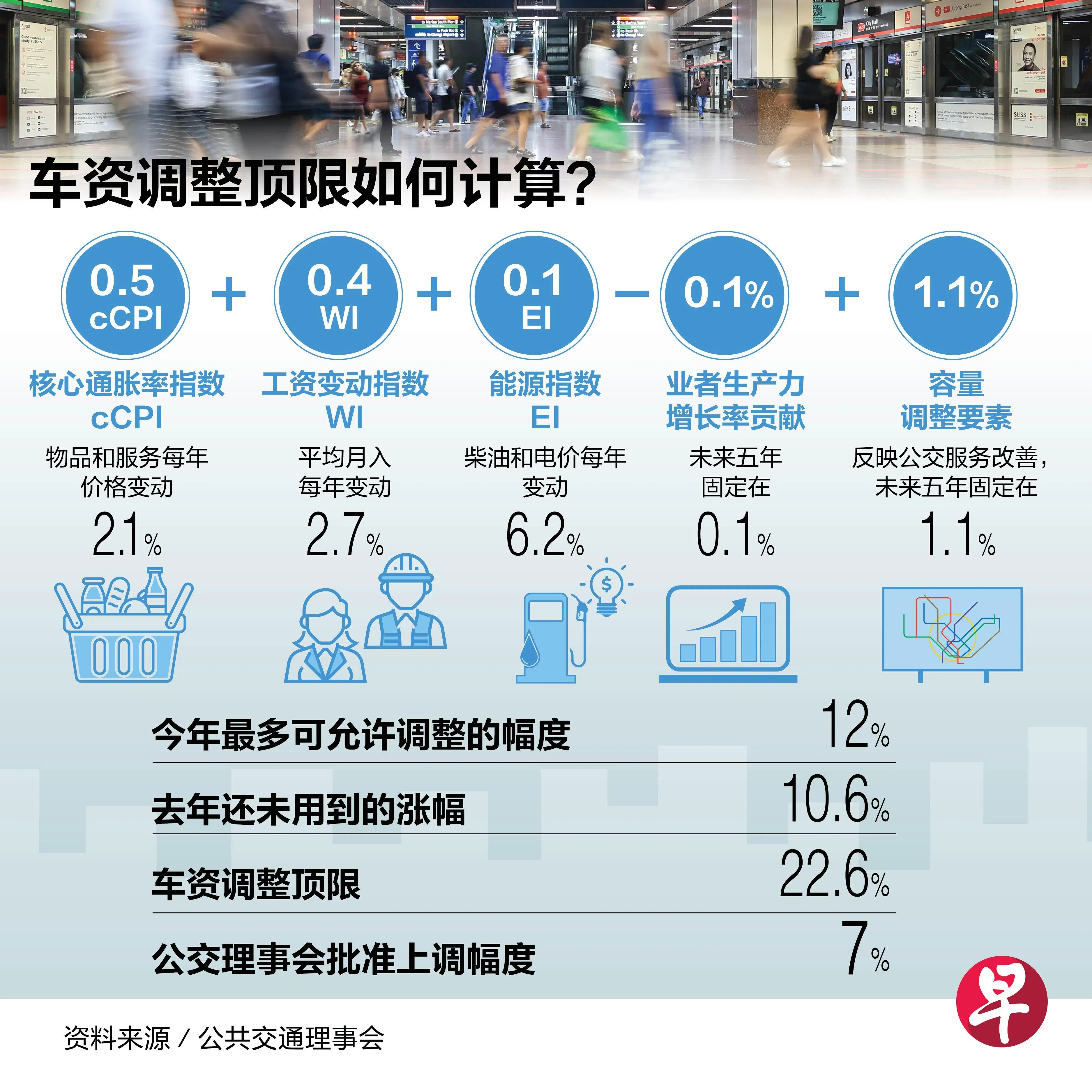 公共交通理事会根据新的车资调整方程式,计算出今年车资可允许上调的顶限为12%。加上去年未用到的10.6%涨幅,车资最多可调高22.6%,是历来最高。