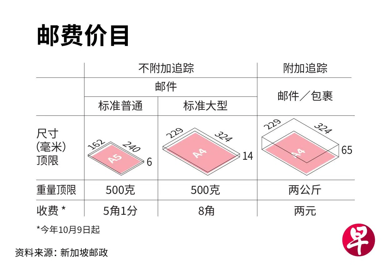 邮政服务的成本持续上升,新加坡邮政星期二(9月19日)宣布,本地邮费今年10月9日起将上调两角钱,普通邮件的邮费将从现有的3角1分调高到5角1分,涨幅约65%。