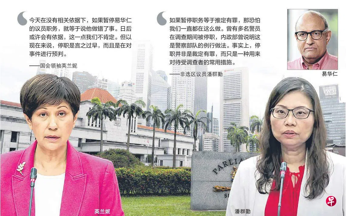 新加坡前进党非选区议员潘群勤和梁文辉星期二(9月19日)提出动议,以暂停易华仁的议员职务,国会领袖英兰妮则动议在调查结果出炉后才处理有关事项。数名议员针对两项动议展开了辩论。