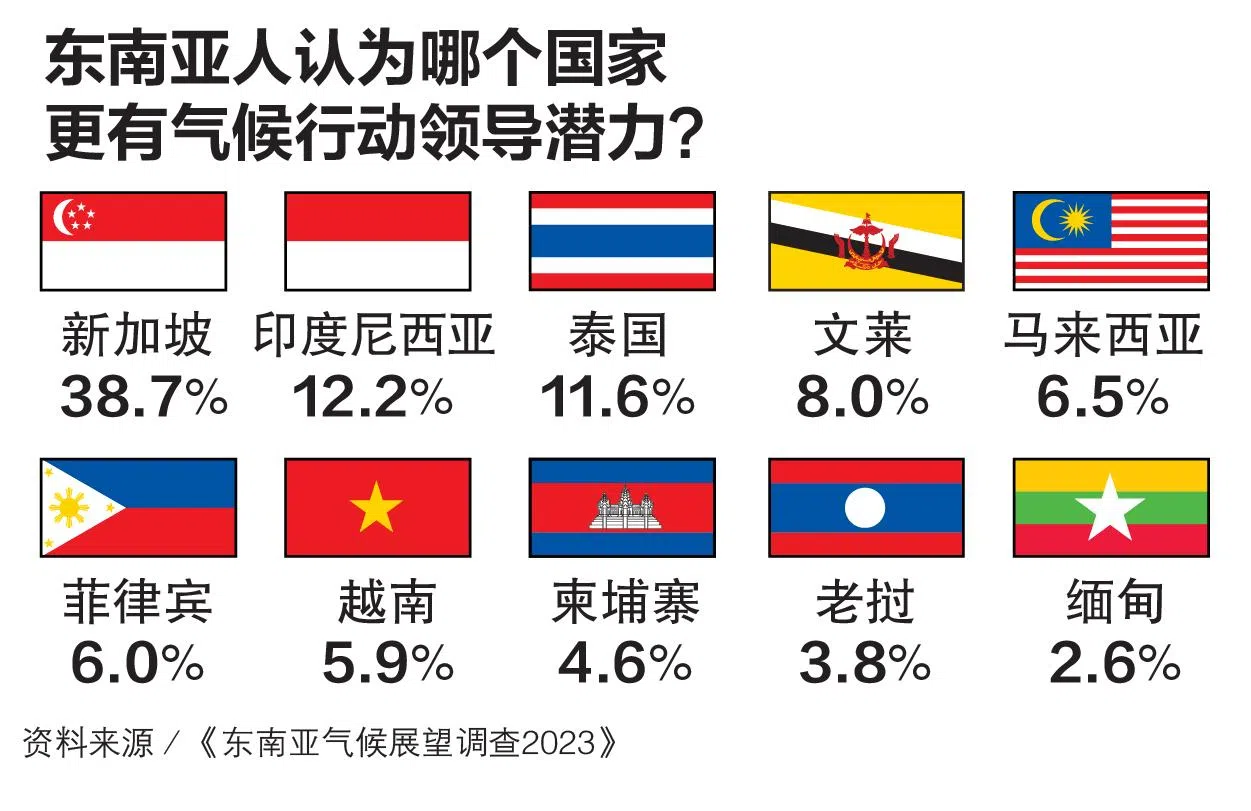 此外,新加坡在10个亚细安国家中脱颖而出,被认为是推动气候行动最具领导潜力的国家,所获支持率达38.7%;印度尼西亚则以12.2%的认可度位居第二。