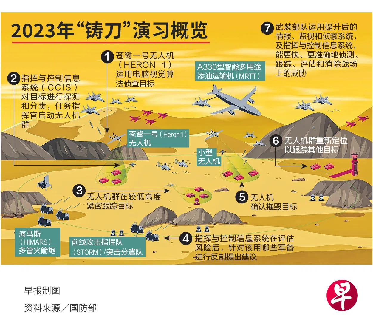爱达荷州的训练空域,是新加坡的20多倍,铸刀演习因此是我国空军部队“试身手”的绝佳机会。今年,空军共派出12架F15-SG型战机、10架F-16型战机、四架AH-64型阿帕奇直升机,以及三架苍鹭一号(Heron 1)无人机。一架A330型多用途添油运输机(Multi-Role Tanker Transport,简称MRTT)也首次亮相,演练自动空对空添油能力。