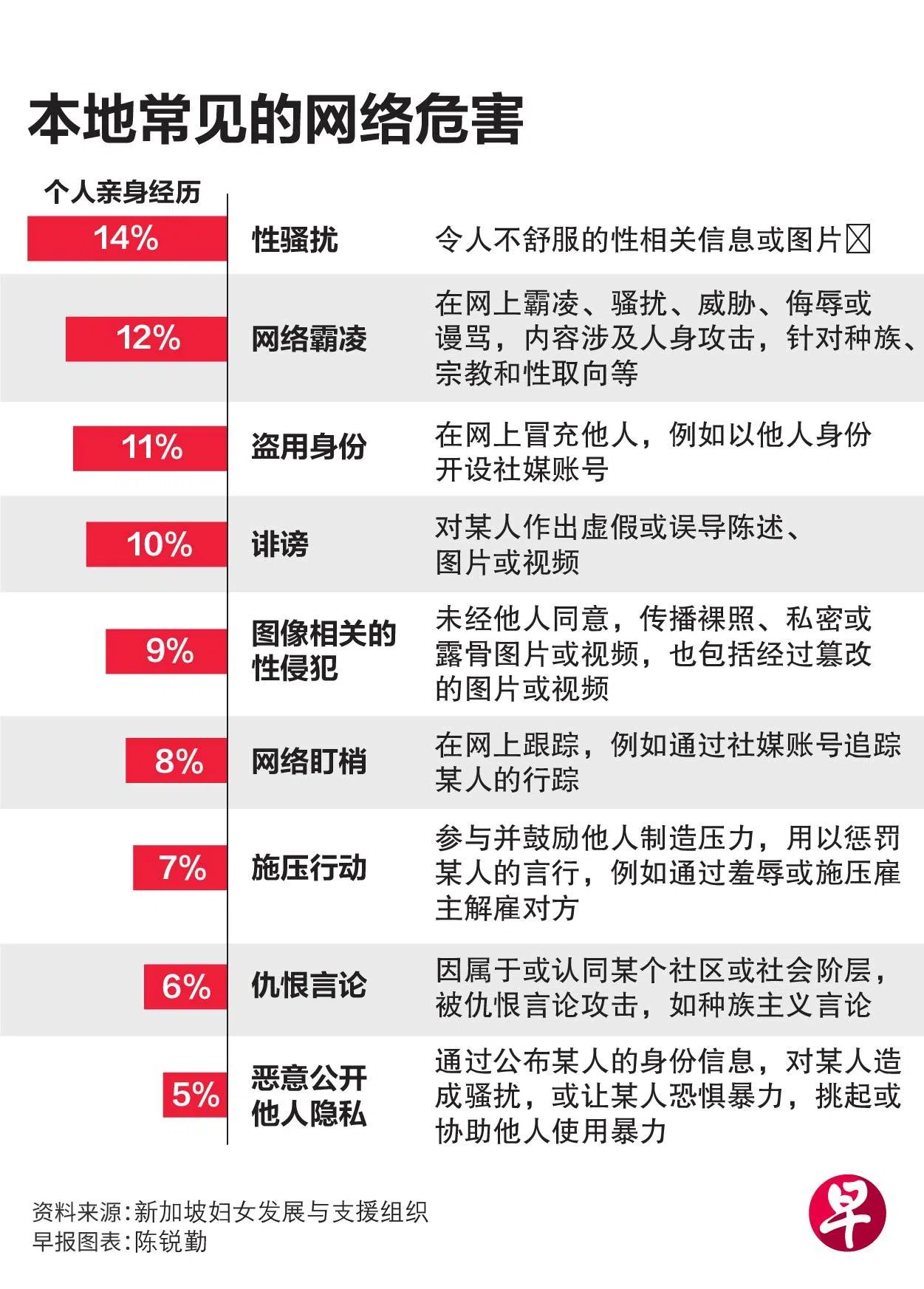 近六成的新加坡公民和永久居民坦承,曾亲身经历或有亲友遭遇过网络危害,而这个现象有年轻化趋势。此外,四分之三的人对于可能具争议的课题选择不发言,可能造成寒蝉效应。