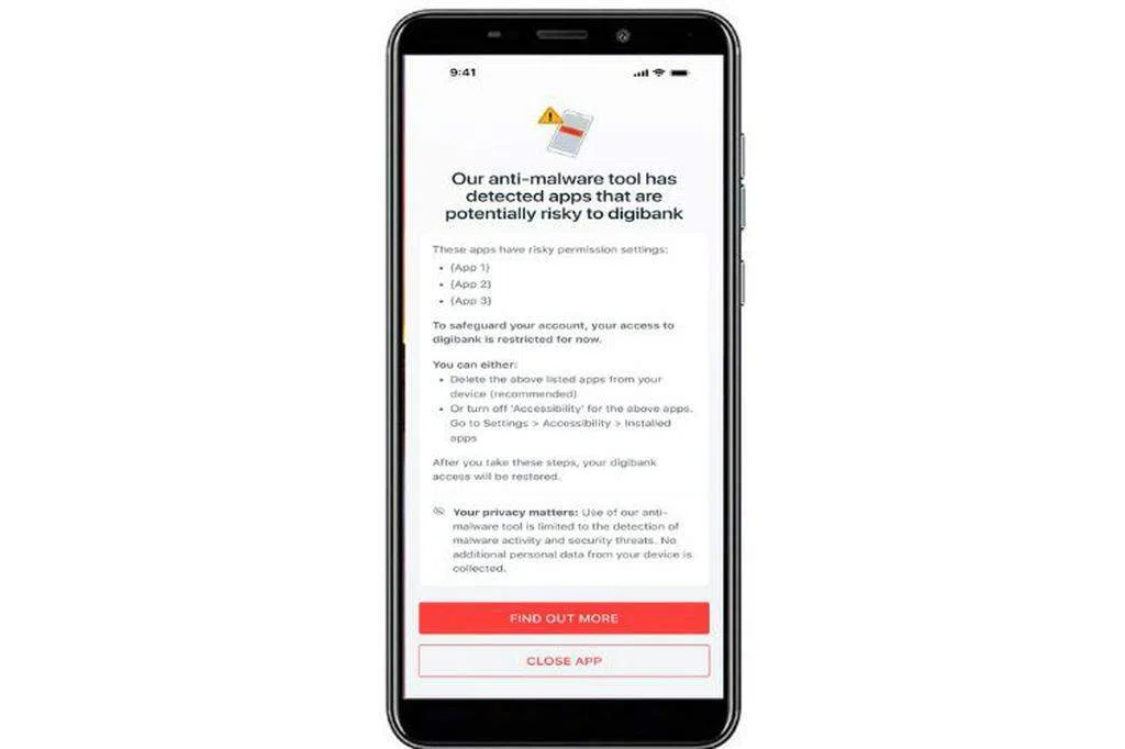 当客户尝试登录手机应用时,新的反恶意软件工具将自动侦测手机内是否有恶意软件。一旦侦测到恶意软件,就会限制客户使用手机应用,直到客户采取必要措施确保安全后,才能继续使用。