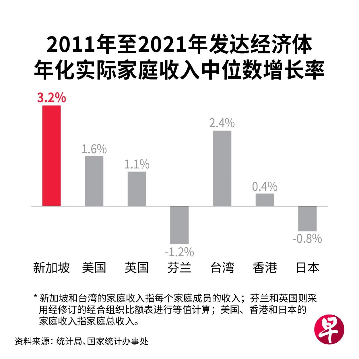他指出,过去10年,我国中等收入雇员中有很大部分人的收入都向上提升。许多人实际上转换了工作,进入更高生产力的企业,一般是较大型本地公司或跨国企业。黄循财也向晚宴嘉宾展示一张图表,显示与美国、英国和芬兰等其他主要发达经济体相比,我国过去10年的家庭收入中位数增长非常强劲。