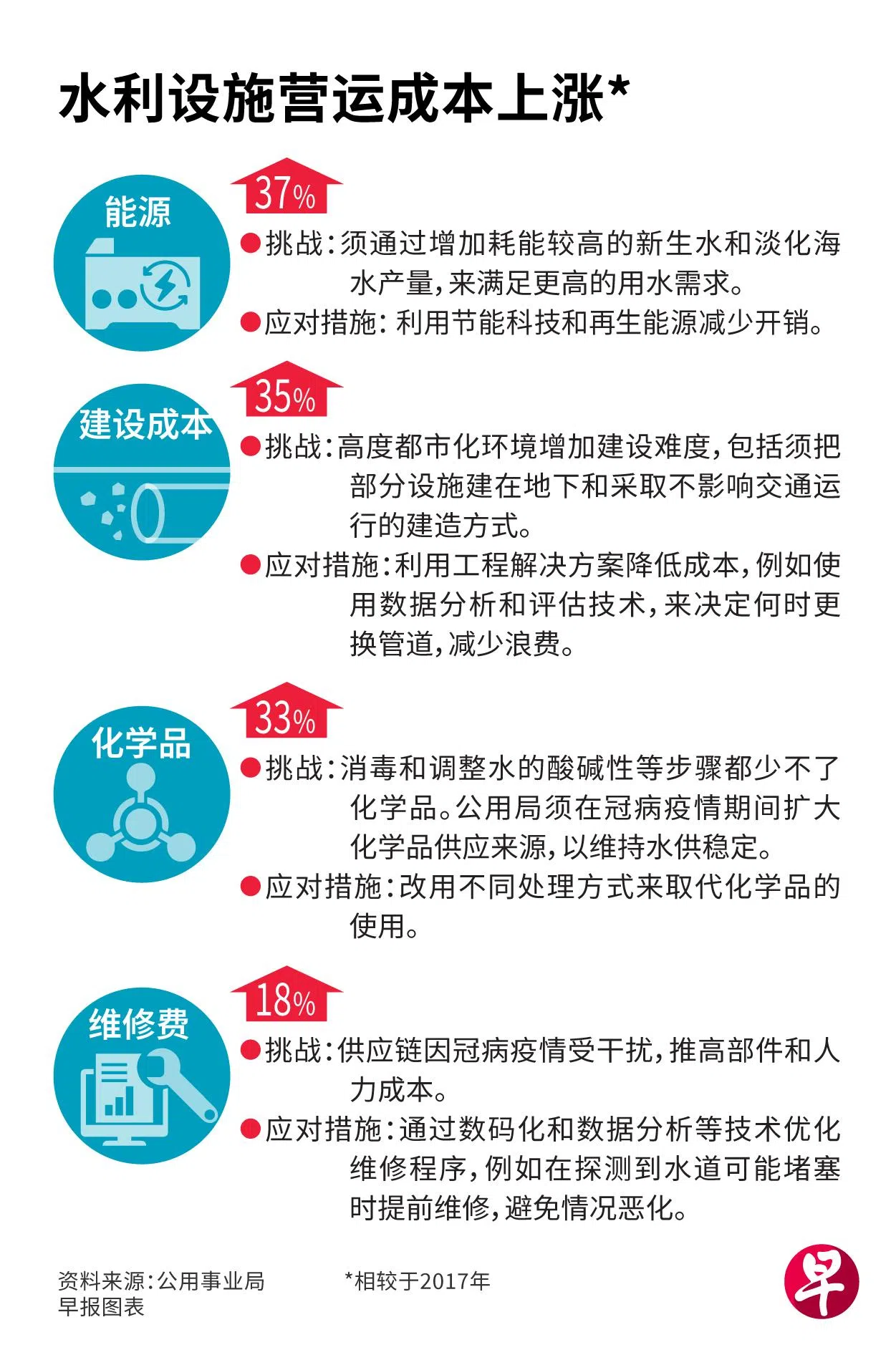 水价上两次调高是在2000年和2017年,这次相隔六年再次宣布上调水价,主要是因为物价这期间上涨,加重公用局的营运负担。与2017年相比,能源成本如今增加37%、建设费用上升35%、化学品上涨33%、维修费增加18%。