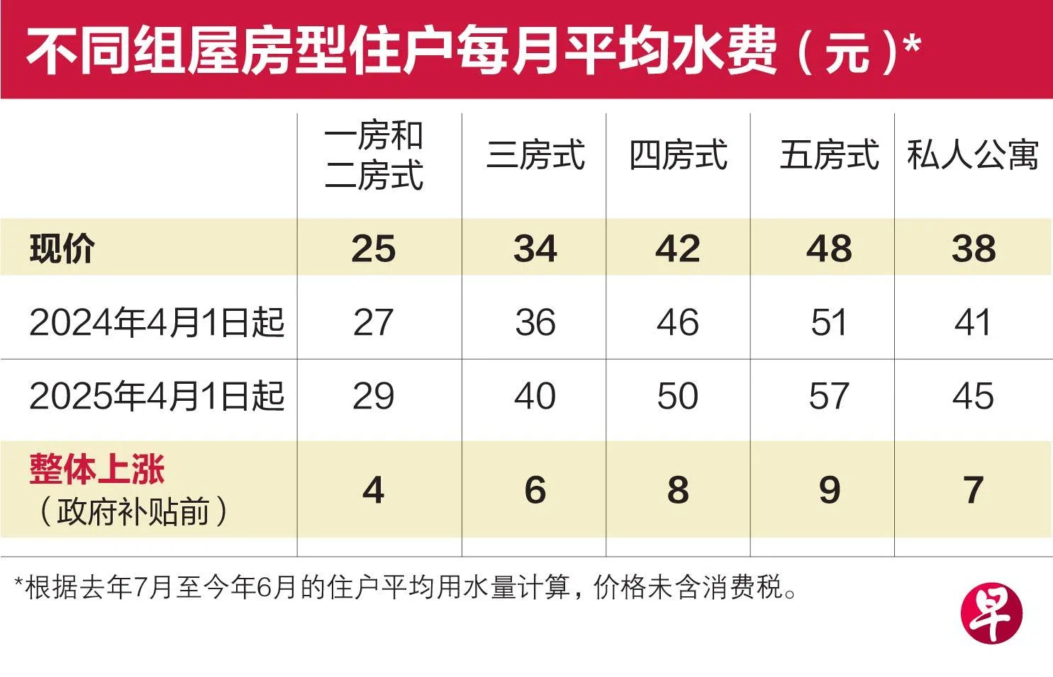 不同组屋房型住户有不同的涨幅,一房和二房式组屋的月均水费将增加4元,其他房型的组屋住户水费将增加6元至9元。私人公寓月均水费将增加7元。价格还未包含政府补贴和消费税。