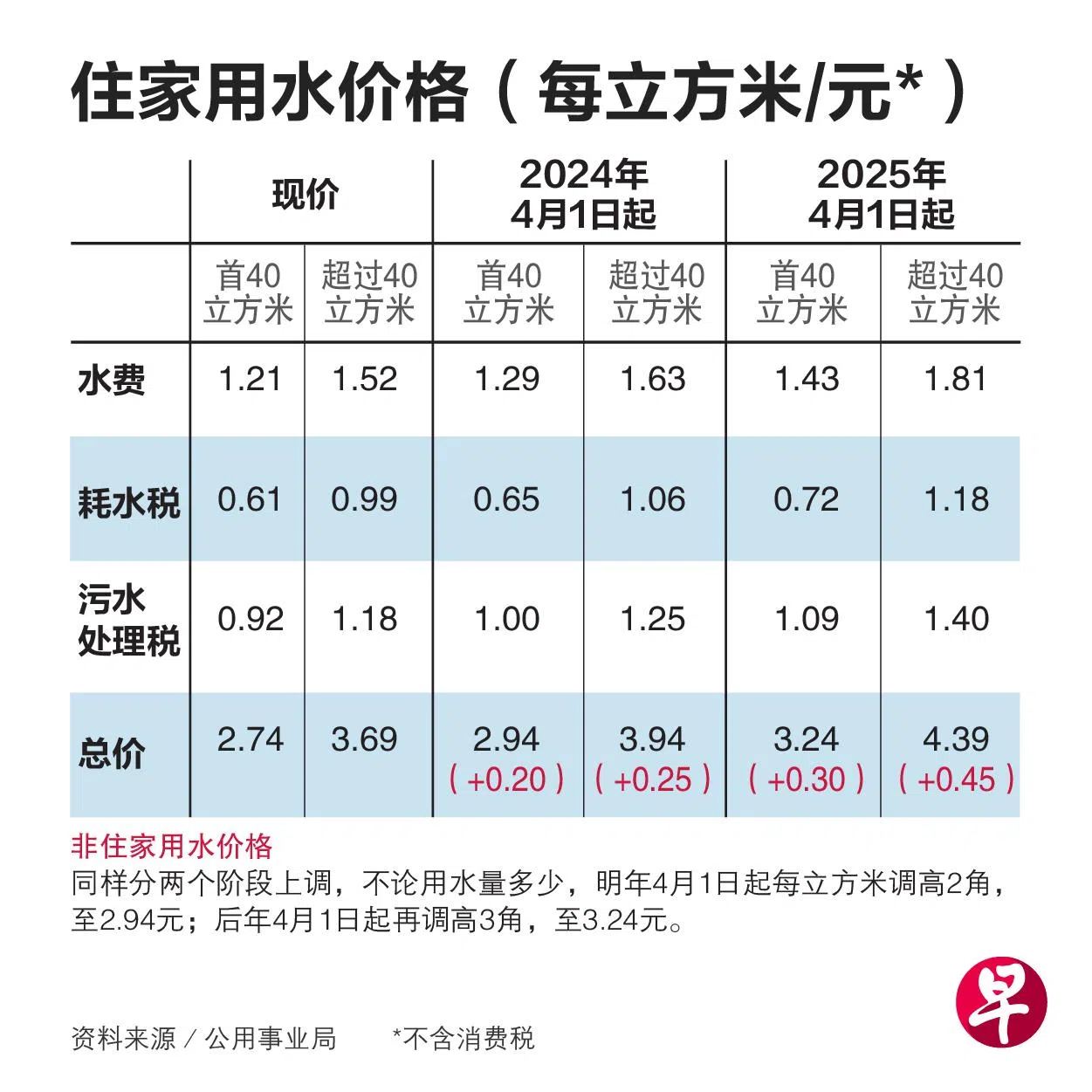 非住家用水价格同样分两个阶段上调,不论用水量多少,明年4月1日起每立方米调高2角,至2.94元;后年4月1日起再调高3角,至3.24元。