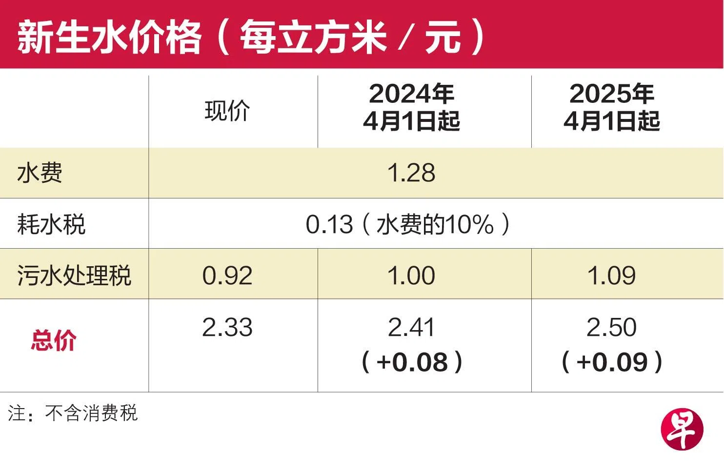 新生水价格也分两个阶段上调1角7分,从现有的每立方米2.33元,增至2024年的2.41元,2025年再上调至2.50元。