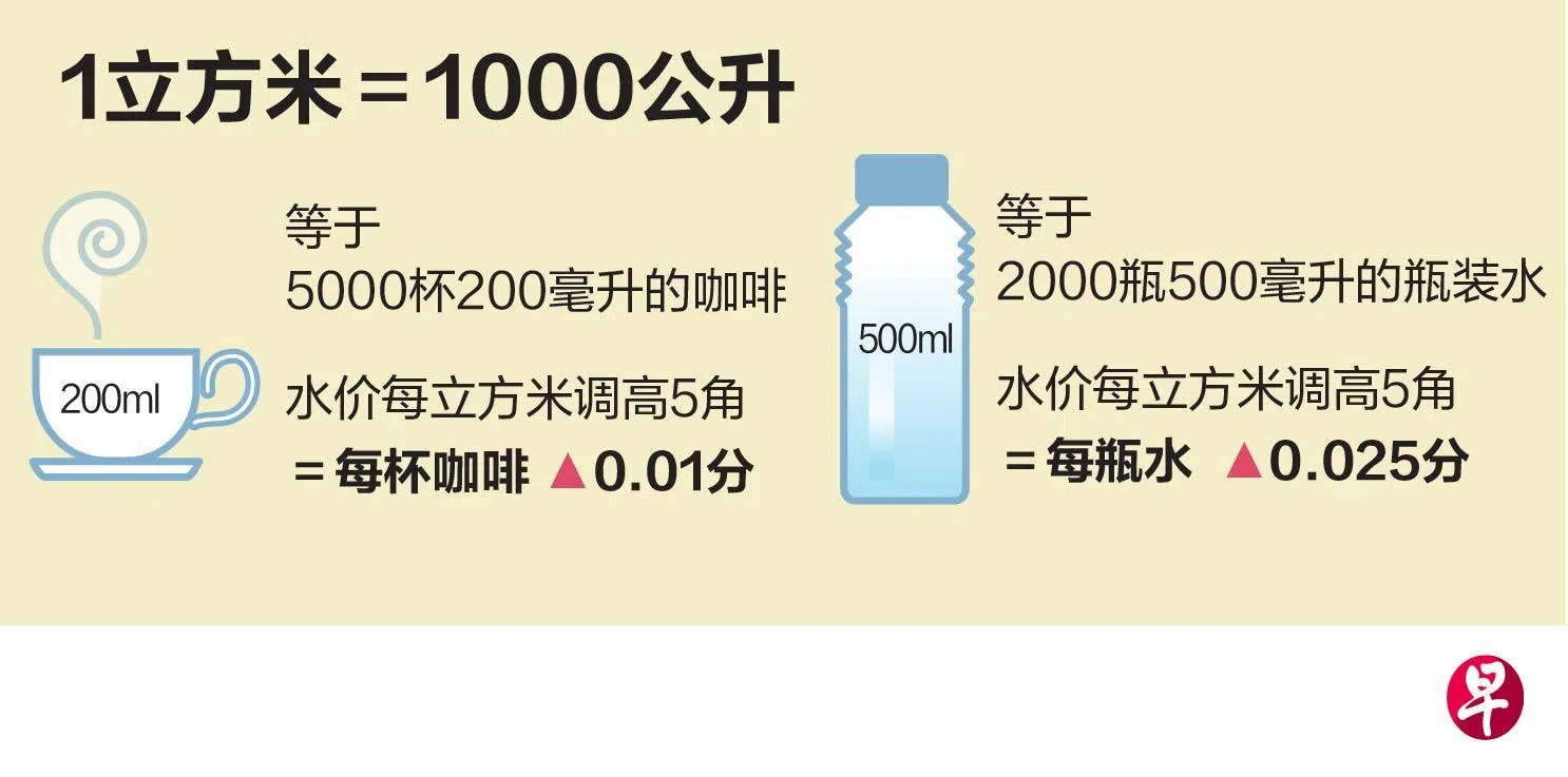 水价以每一立方米计算,一立方米等于1000公升的水,水价每立方米调高5角,意味着每一杯200毫升的咖啡起0.01分,或每一瓶500毫升的瓶装水起0.025分。