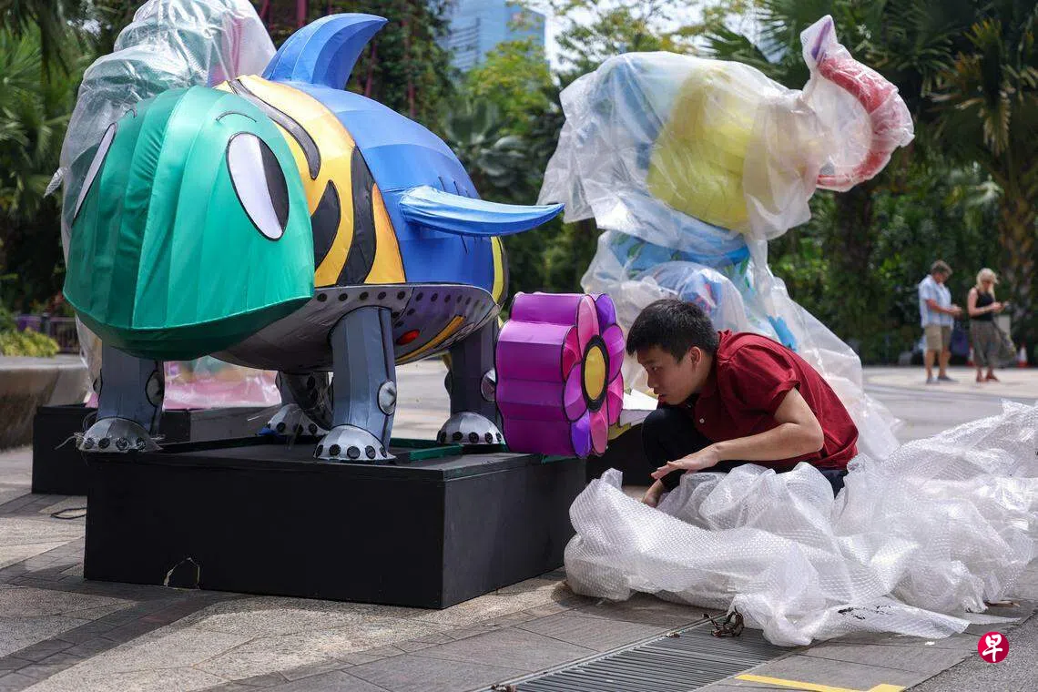 今年滨海湾花园的中秋灯展中,有五个外观别致的花灯,由造型天马行空的变色龙、毛毛虫、大象等动物组成。