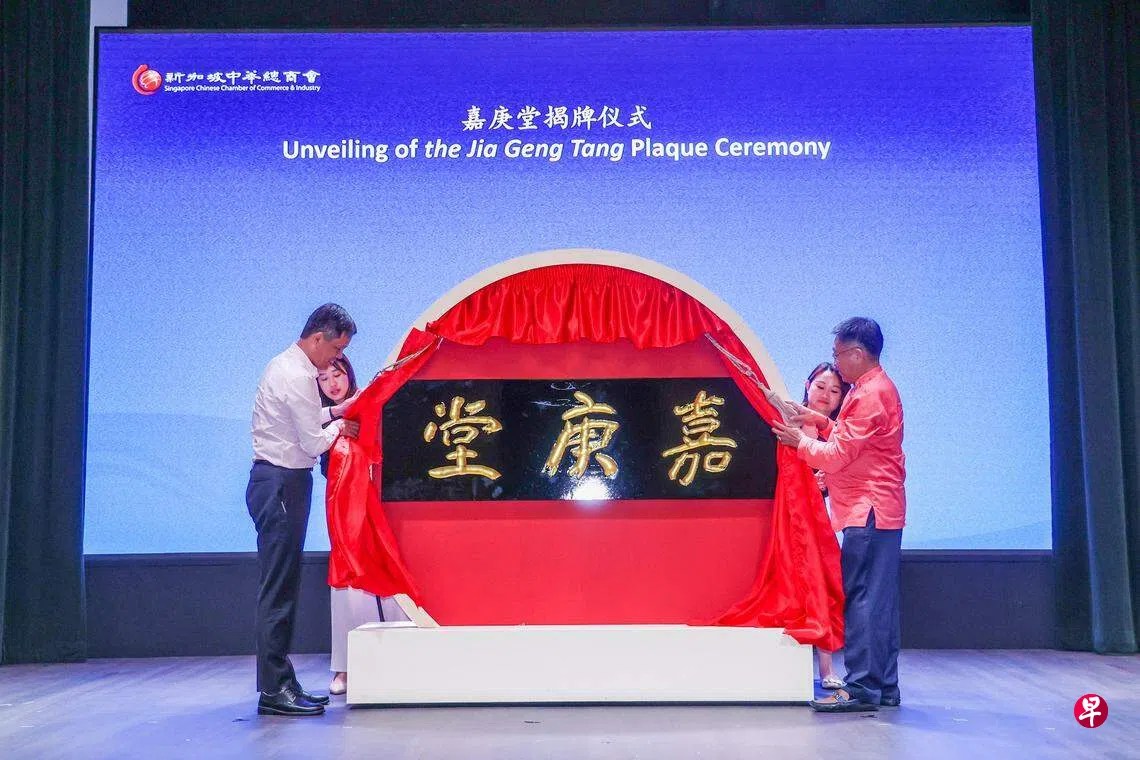 位于禧街的中华总商会大厦2017年开始翻新,去年9月10日完成,保留了大礼堂“嘉庚堂”的名字。总商会这次邀请本地知名书画家林子平代为润笔,并邀请陈振声见证嘉庚堂的揭牌仪式。