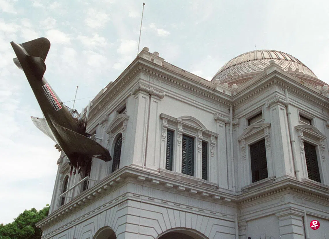 别慌,那只是新加坡历史博物馆(现国家博物馆)在2000年,为配合太平洋战争回顾展设计的道具。远看,还真像战斗机一头栽进建筑物中。