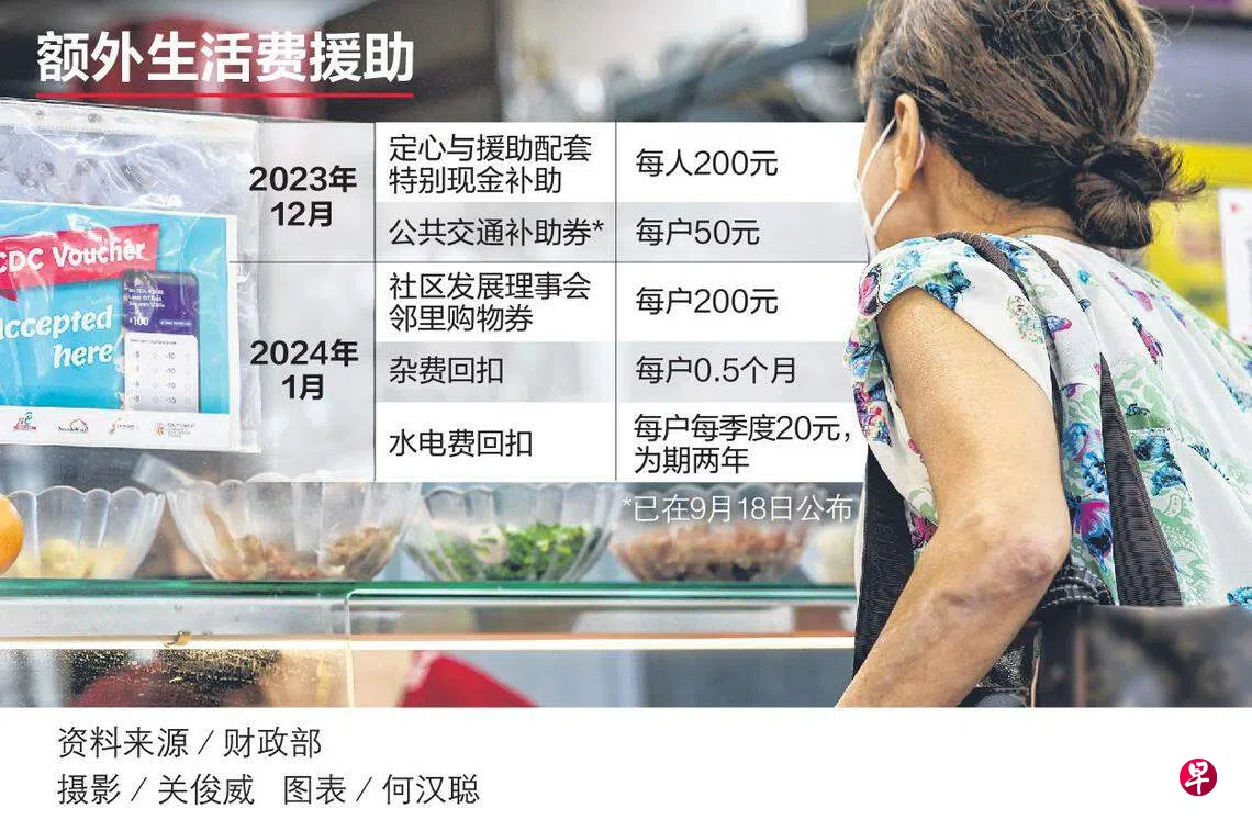 这包括向大约250万名成年新加坡人发放200元的额外定心与援助配套特别现金补助,让他们今年12月可获得的现金补助提高至800元。每户家庭明年1月可领取的社理会邻里购物券,也会从300元增至500元。