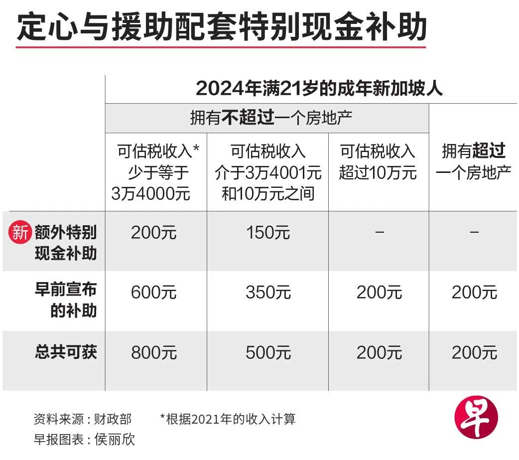 获得最多现金补助的是只拥有不超过一个房地产、可估税收入不超过3万4000元的成年公民。他们除了可获得早前宣布的600元现金援助,还可另外获得200元。