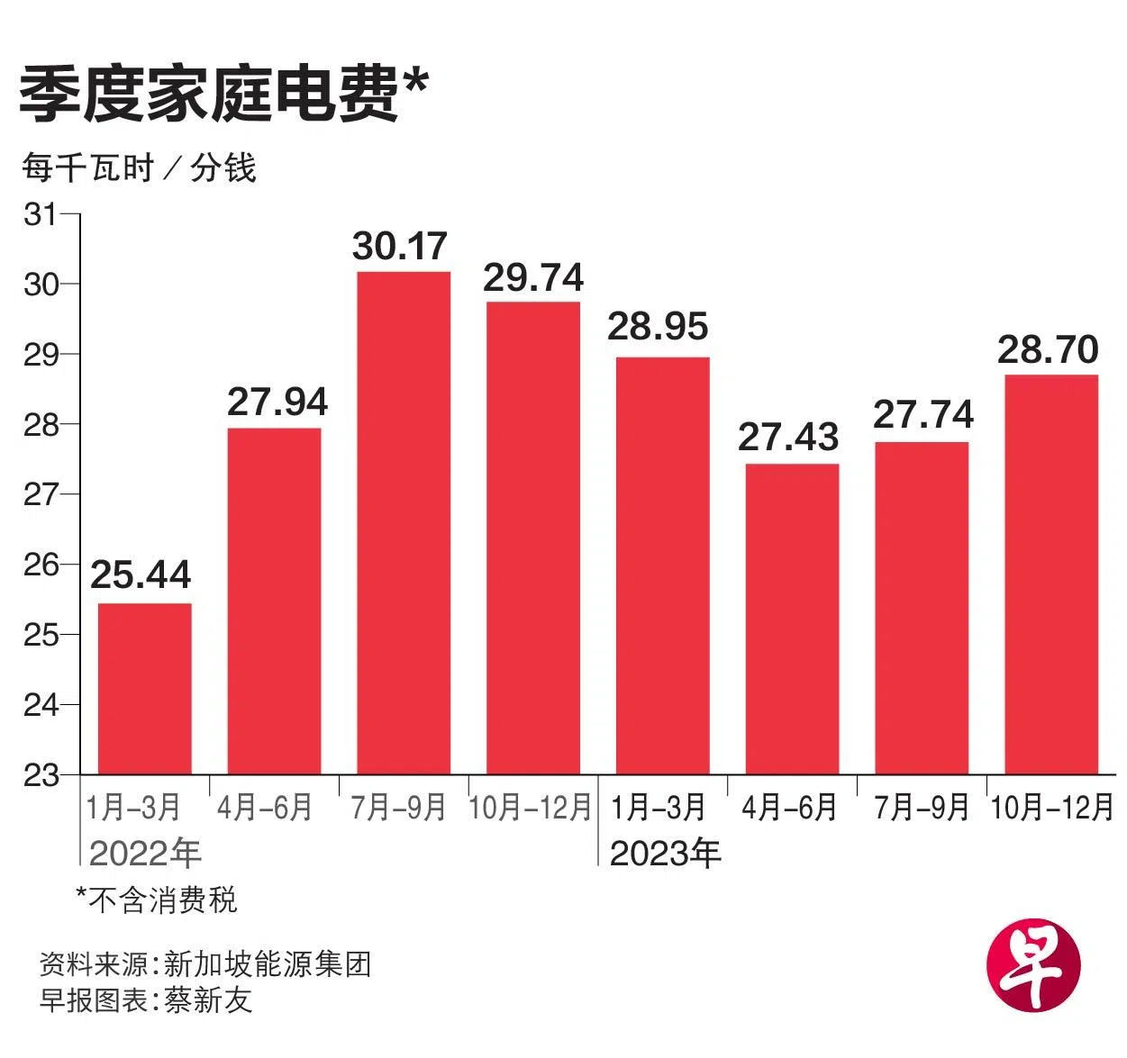 新加坡能源集团星期五(9月29日)发文告宣布,10月至12月第四季的住家电费,将从每千瓦时27.74分上涨至28.70分。调涨之后,四房式组屋家庭每个月电费,平均会增加3.57元(不含消费税)。