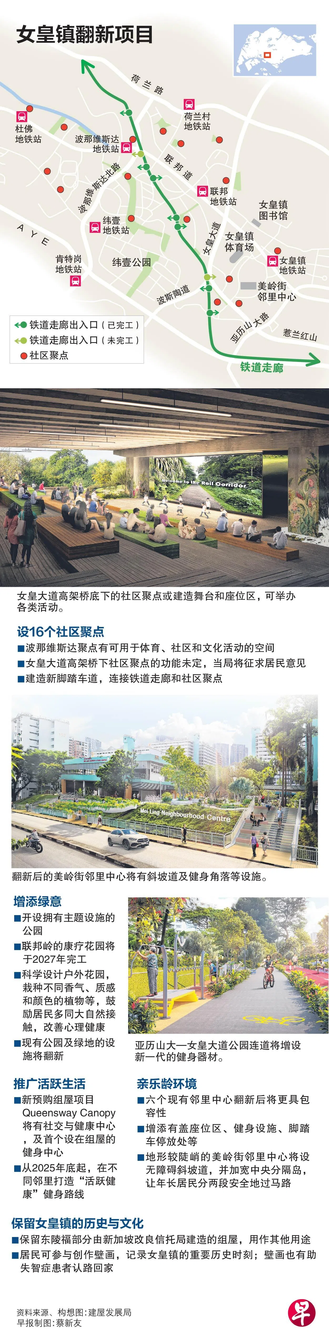 贯穿女皇镇区内的铁道走廊部分路段上将设新的社区聚点,让居民更靠近休闲空间和绿地。