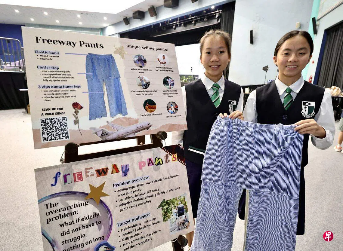 这款名为Freeway Pants的裤子,是莱佛士女子中学的杨佩文(15岁)和吴佳恩(15岁)为配合学校课程而设计的作品,获得陈嘉庚青少年发明奖中学组的优异奖。